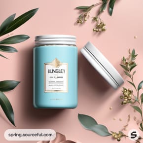 Light blue jar with a white lid, styled with green leaves on a blush background.