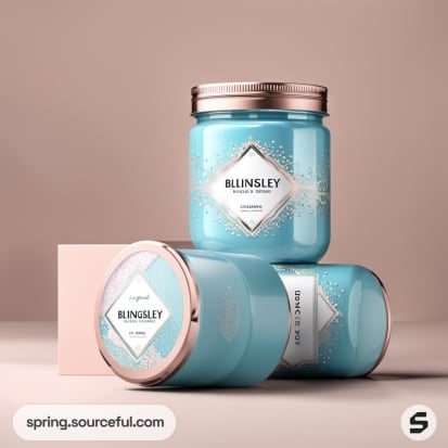 Blue jars with silver lids and geometric labels, staged on pastel backgrounds.