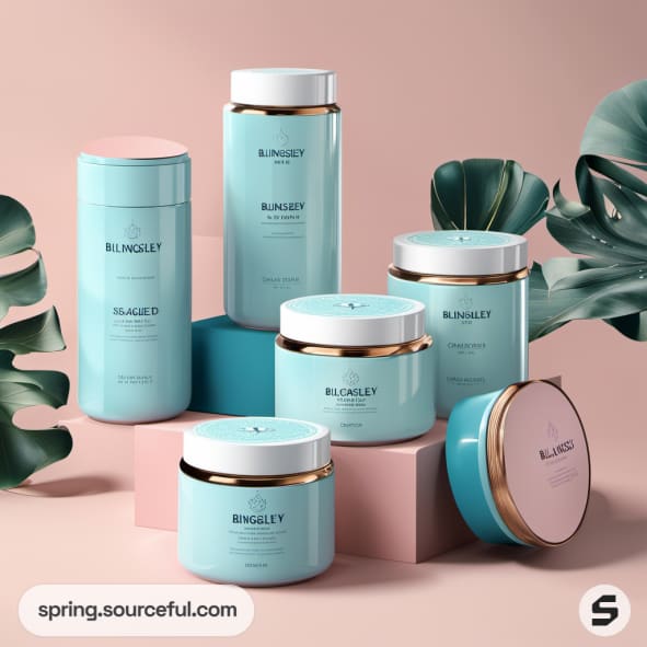 Turquoise and pink jars with gold accents, surrounded by tropical leaves on a pastel background.