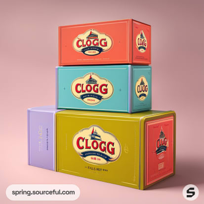 Stacked boxes with vintage 'CLOGG' designs in bold colors.