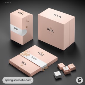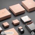 Diverse peach and white boxes with elegant branding.