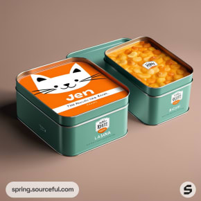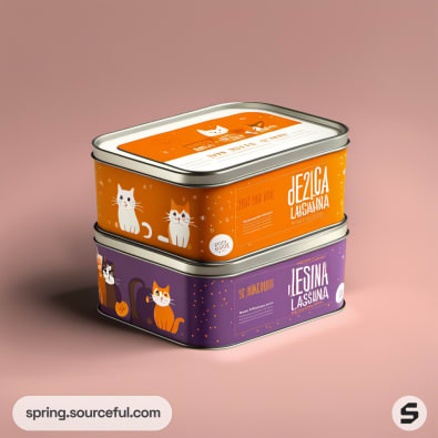 Stacked rectangular tins with orange and purple cat-themed design.