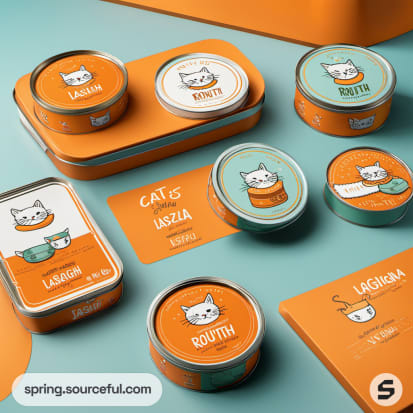 Orange and teal tin boxes with cat illustrations and food labels.