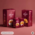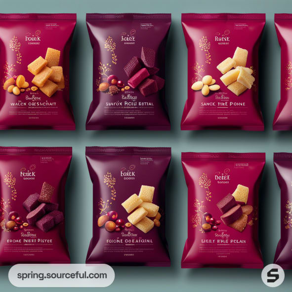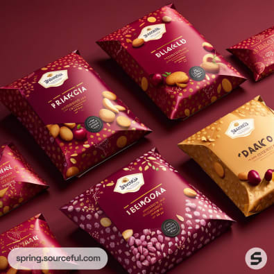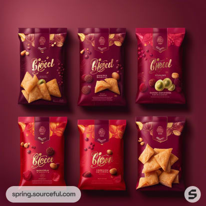 Assorted snack bags with vibrant red and yellow designs and nut illustrations on a red surface.
