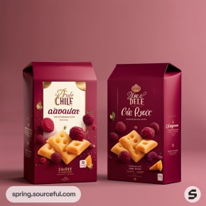 Two raspberry-themed packaging boxes for crackers with elegant design elements on a burgundy gradient background.
