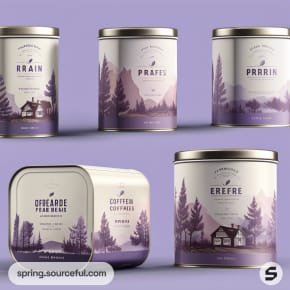 Coffee canisters with scenic illustrations and purple color scheme on a gradient purple background.