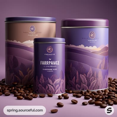Three cylindrical tins with purple and brown scenic designs, surrounded by coffee beans.