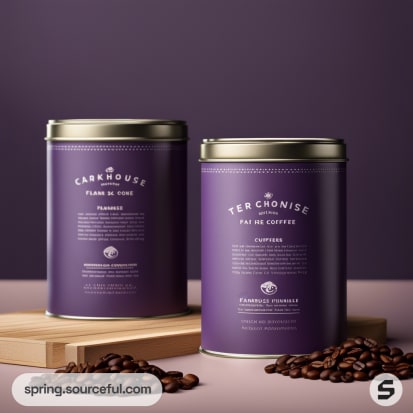 Two cylindrical coffee tins with purple labels on a light purple background, with coffee beans scattered in front.