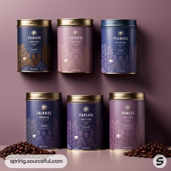 Six cylindrical coffee tins in dark blue, purple, and brown shades, with coffee beans scattered at the bottom.