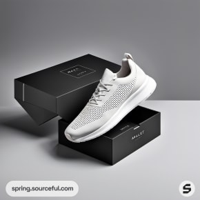 White athletic shoe on an opened black box.