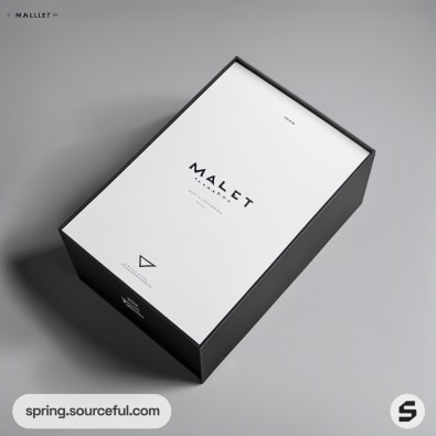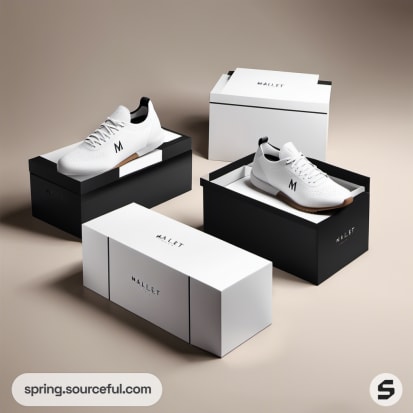 Black and white shoe boxes with minimalist branding design.