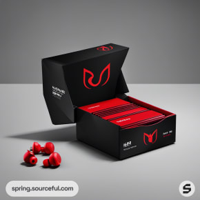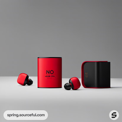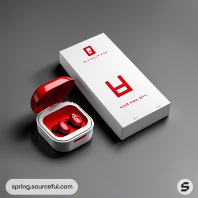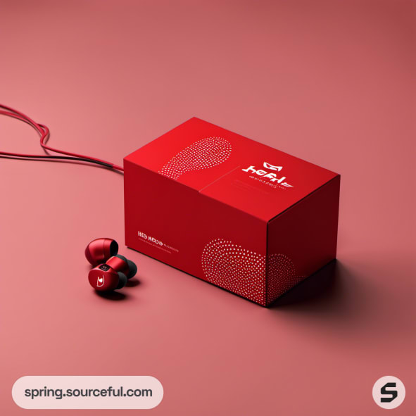 Red boxed earphones package on a gray backdrop, featuring earbuds image and product details.