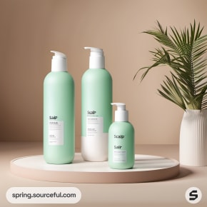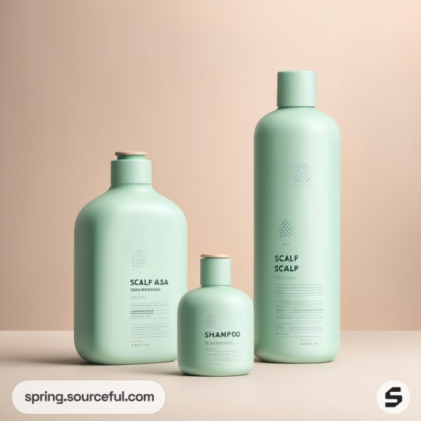Three mint green shampoo bottles on beige background.