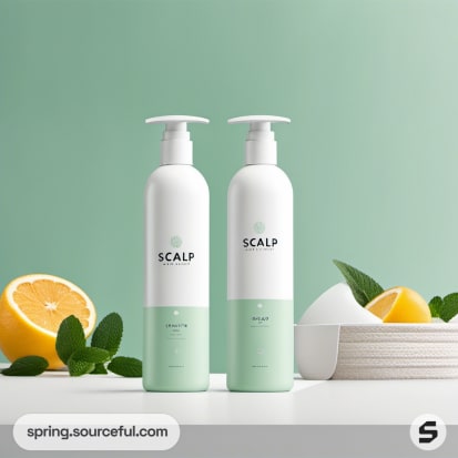 Four pastel shampoo bottles with citrus and mint.