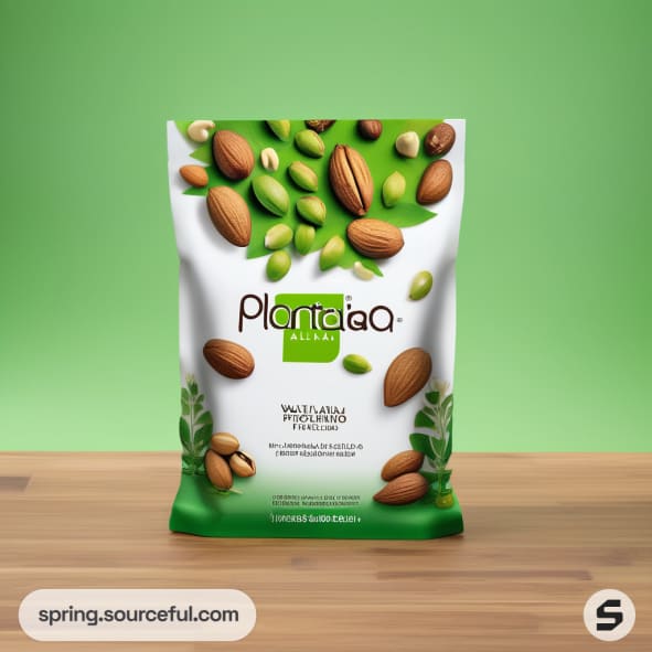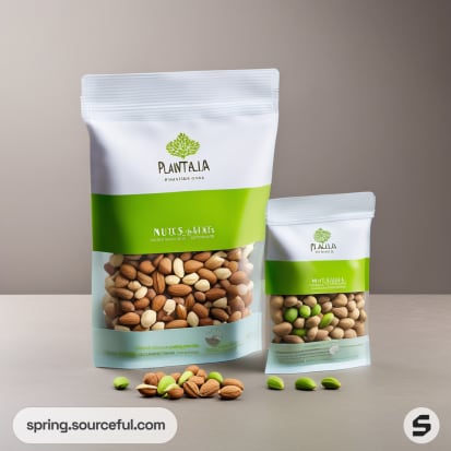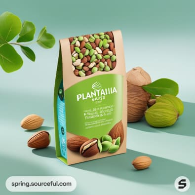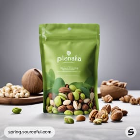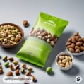 Discover luxurious and vibrant packaging inspiration for a mix of nuts including walnuts, almonds, pistachios, and hazelnuts. Our eco-friendly design utilizes a recycled mailer bag, promoting sustainability without compromising on style. The light green, white, and blue color scheme adds a fresh and appealing look to the packaging. Elevate your nut mix product with our unique, high-quality design that combines luxury with environmental consciousness.