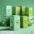 Various green boxes of different sizes with minimalist designs and tulip graphics.