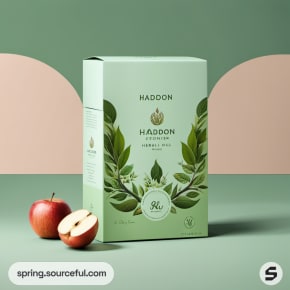 Large box with leafy graphic design, flanked by red apples on a green and peach background.