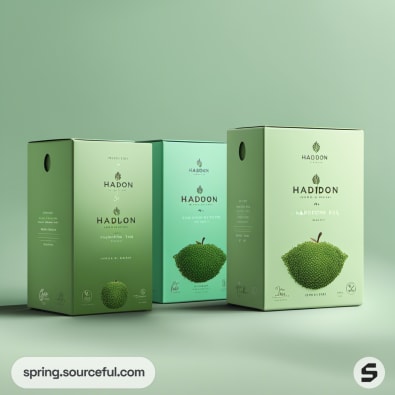 Three tall boxes with green and blue hues, featuring graphics of leaves and jackfruits.