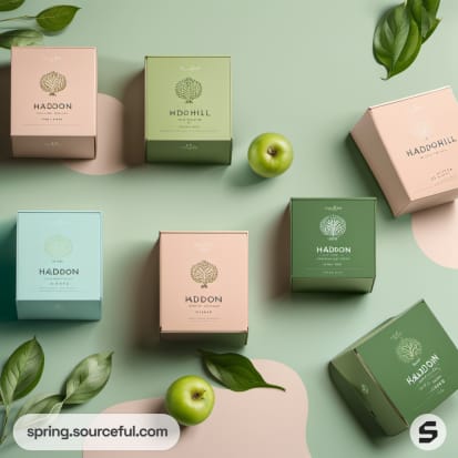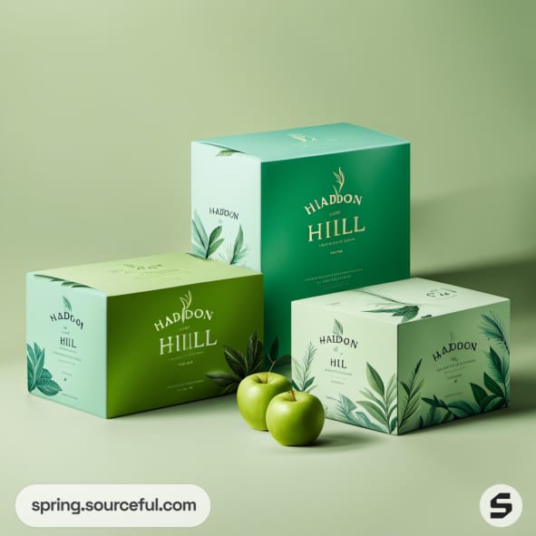 Assorted green boxes with mountain and leaf designs, beside apples and greenery.