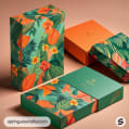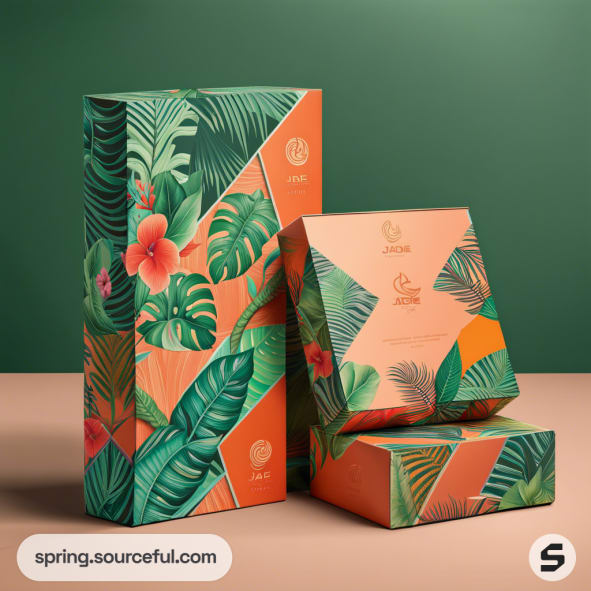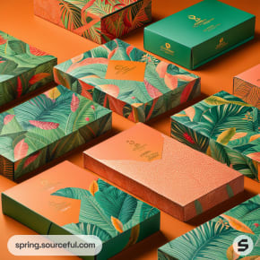 Tropical themed boxes with vibrant leaf and flower patterns on green and orange backgrounds.