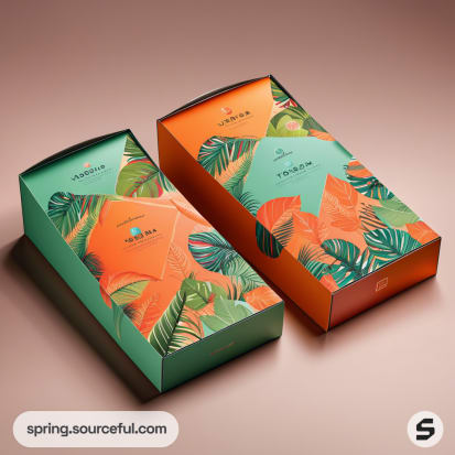 Two tropical themed rectangular boxes in green and orange with leaf patterns on a beige background.