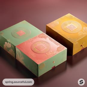 Pastel colored square boxes with embossed circular designs in green, orange, and yellow.