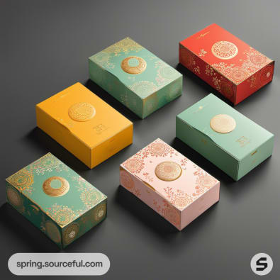 Rectangular boxes with intricate circular designs in pink, red, green, and yellow.