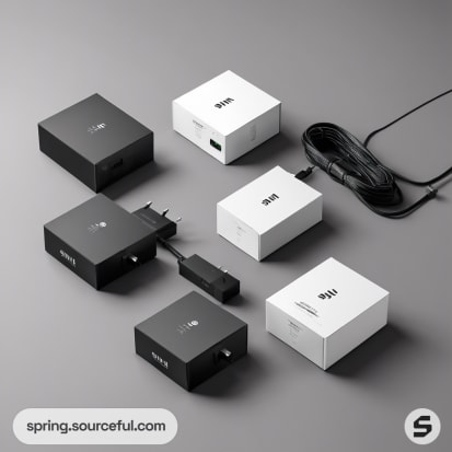 Discover the perfect blend of industrial, eclectic, and simple aesthetics with our black cable charger packaging inspiration. Our carton product boxes, featuring a sleek color scheme of white, slate gray, and black, are designed to captivate and impress. Experience the fusion of functionality and style in our unique packaging design for black cable chargers. Elevate your product presentation with our innovative and visually appealing packaging solutions.