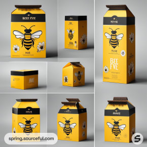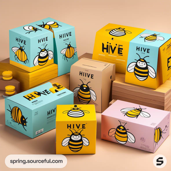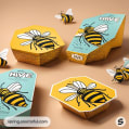 Bee-themed packaging set with multiple box shapes and styles.
