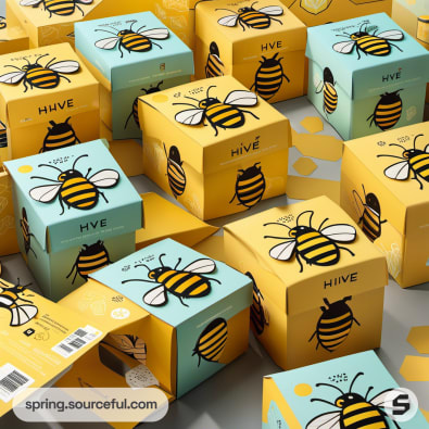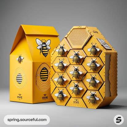 Hexagonal teal and yellow bee-decorated packaging boxes.