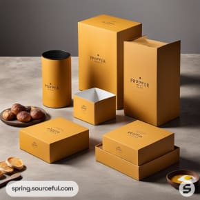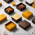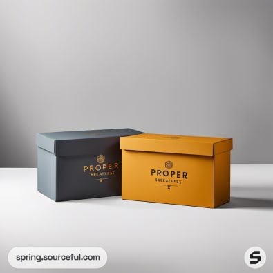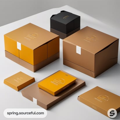 Yellow and brown boxes with white label lids, arranged on brown surface.