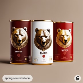 Three cylindrical tins with gold bear heads on red and white backgrounds.