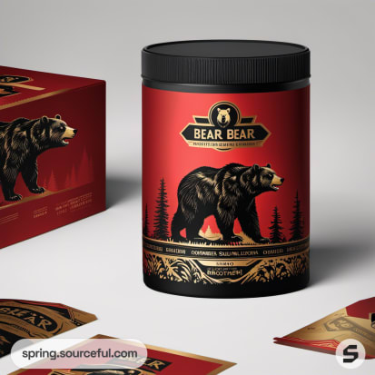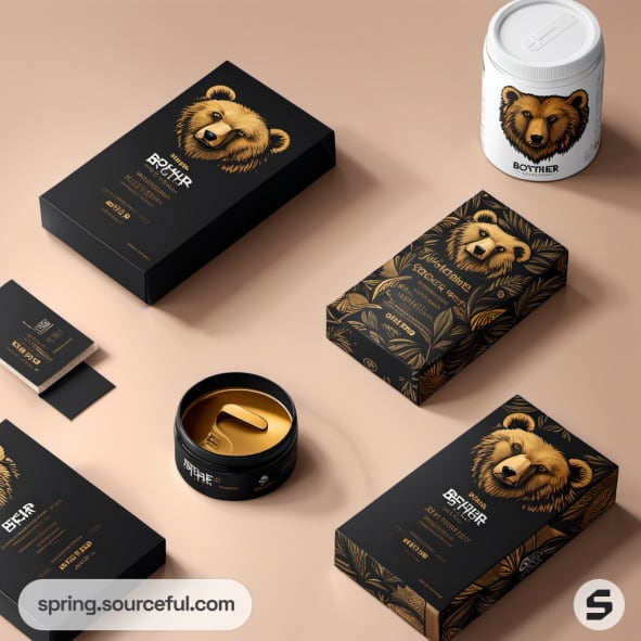 Black and gold packaging with bear illustration on mailer boxes and cards.