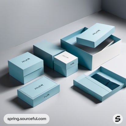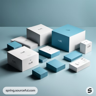 Assorted blue and white boxes placed on a white surface.