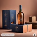 Orange and navy gift box with a bottle of amber liquor and a full glass next to it.
