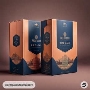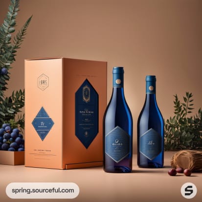 Two blue wine bottles with gold accents next to a tan colored box with blue design elements, set on a brown surface.