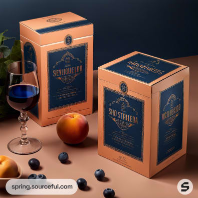 Peach-colored wine boxes with blue labels next to a glass of red wine, peaches, and blueberries.