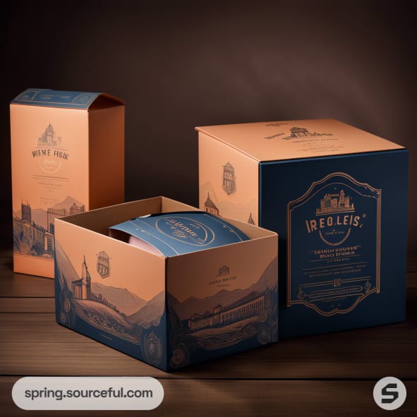Elegant cardboard boxes with intricate designs and dark blue labels on a wooden surface.