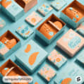 Assorted playful box designs in orange and blue with shoe and fruit graphics.