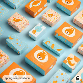 Bear-themed child's packaging with playful designs in orange and blue boxes.