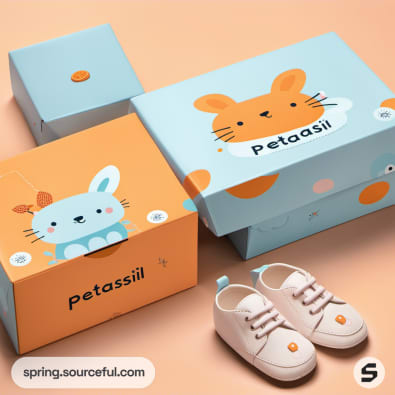 Animal-themed shoe boxes in orange and blue with cartoon rabbits and cats, paired with kids' shoes.