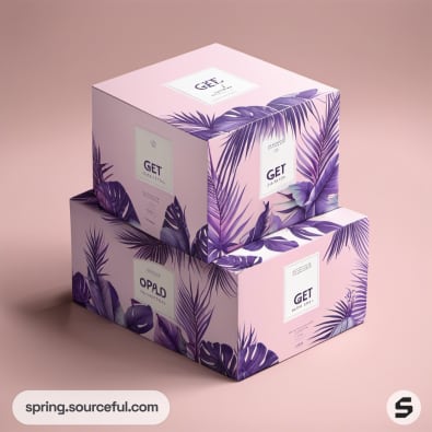 Two stacked boxes with purple leaf design on pink background.