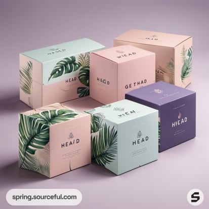 Six boxes with various pastel colors and leaf patterns.