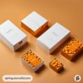 Orange and white rectangular boxes with small round balls inside on a light brown surface.