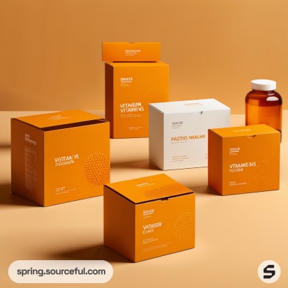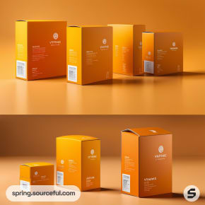 Assorted orange and white cardboard boxes on a brown surface, each with a circular logo and text.