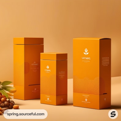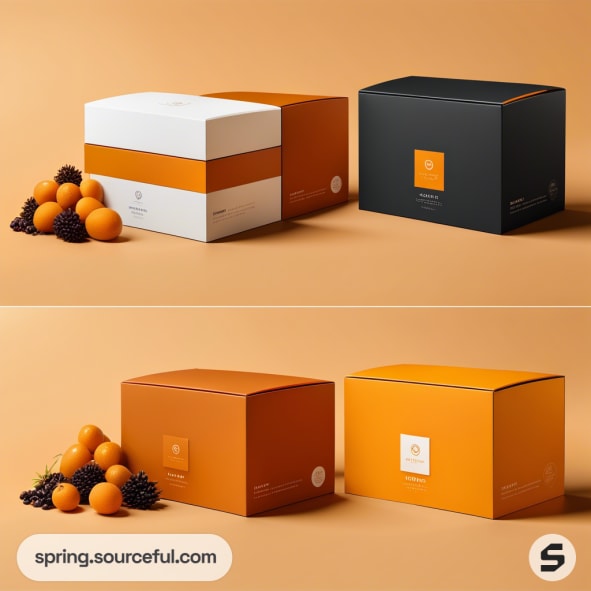 Three brown and orange rectangular boxes with product descriptions, alongside a small white box, on a beige background.