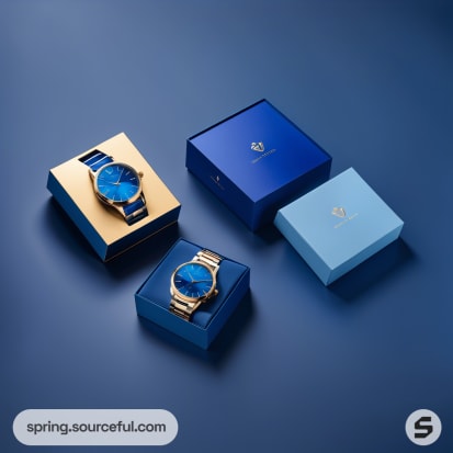 Blue watch gift boxes open to display wristwatches with leather straps, set on a minimalist grey surface.