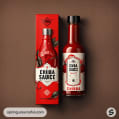 Sauce bottle with ornate label and matching red box with chili pepper imagery.