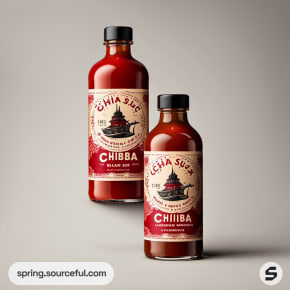 Two sauce bottles with vintage-style labels, featuring a pagoda design against a gradient background.