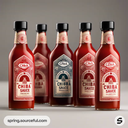 Chili sauce bottles and decorative packaging with chili illustrations and red labels.